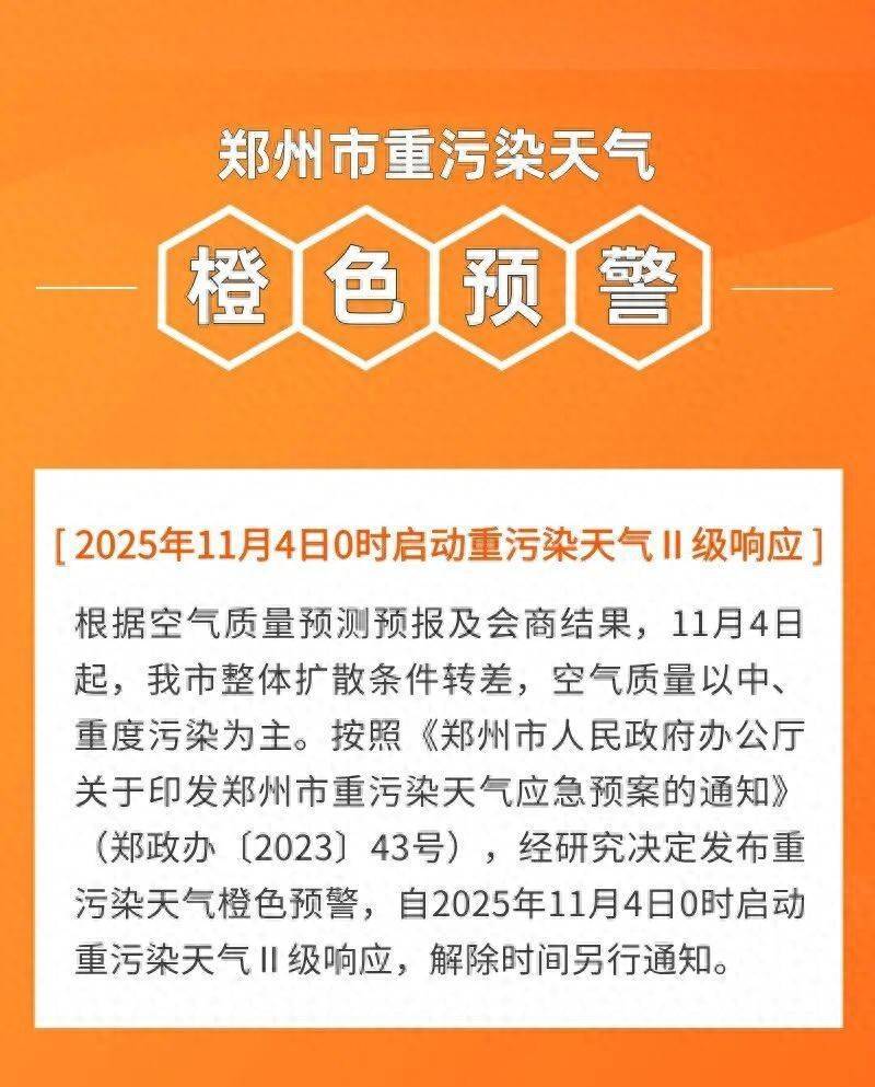 【大河财立方消息】据郑州市生态环境保护工作专班污染防治攻坚办公室,根据空气质量预测预报及会商结果,11月4日起,郑州市整体扩散条件转差,空气质量以中、重度污染为主。经研究决定发布重污染天气橙色预警,自2025年11月4日0时启动重污染天气Ⅱ级响应,解除时间另行通知。